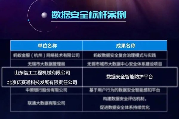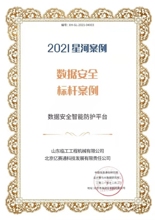 山东银河优越会(GEG)-首页欢迎您工程机械有限公司和北京亿赛通科技发展有限公司联合申报的“数据安全智能防护平台”应用成果凭借其专业的技术及完善的解决方案,从350余份项目中脱颖而出,成功当选本届大数据星河案例“数据安全标杆案例”。